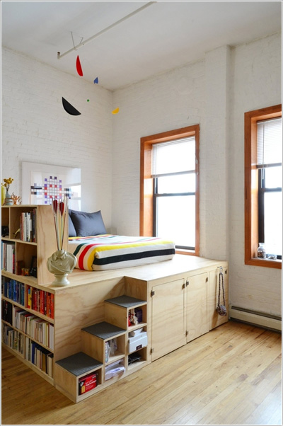 Nâng chiếc giường cao hơn thông thường, bạn sẽ có thể bố trí rất nhiều nơi để đồ dưới gầm giường, bậc thang và tạo ra tủ sách ngăn cách với các không gian khác.