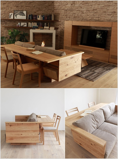 Chiếc sofa đa chức năng cũng có thể là bàn việc, bàn ăn. Thiết kế của mặt bàn giúp ghế có thể xếp gọn gàng.