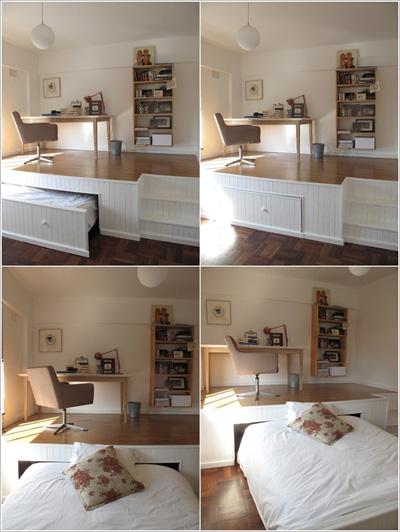 Nếu nhà bạn chỉ có một phòng chung cho cả nơi làm việc, tiếp khách, ngủ nghỉ, bạn có thể lựa chọn giải pháp nâng cao một phần sàn nhà. Giường được giấu gọn phía dưới sẽ được kéo ra khi cần sử dụng.