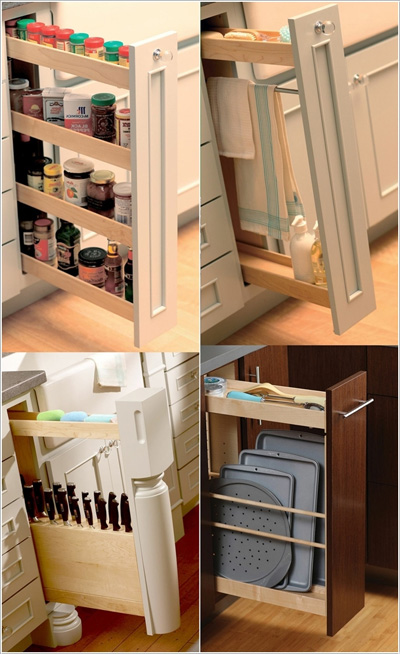 Những khoảng trống hẹp giữa các ngăn tủ có thể cất được rất nhiều hộp đựng gia vị, dao kéo...
