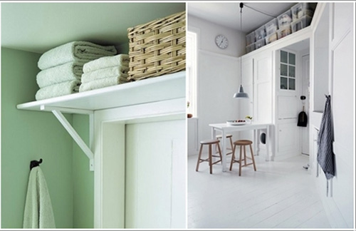 Khoảng trống giữa cửa ra vào và trần nhà có thể biến thành nơi để đồ dùng nhà tắm hoặc quần áo ít sử dụng.