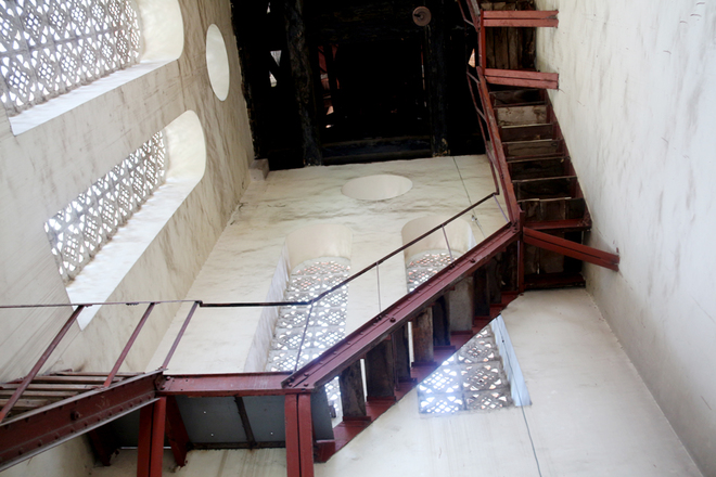 Ngoài kiến trúc đặc sắc, bên trong nhà thờ Đức Bà còn có những "cổ vật" đặc biệt mà không nhiều người được biết, ở 2 tháp chuông cao gần 58 m và gác đàn nằm tại ngọn tháp này (đối diện bàn thờ chính). Trong ảnh là cầu thang duy nhất dẫn lên tháp chuông nhà thờ, rộng khoảng 40 cm.