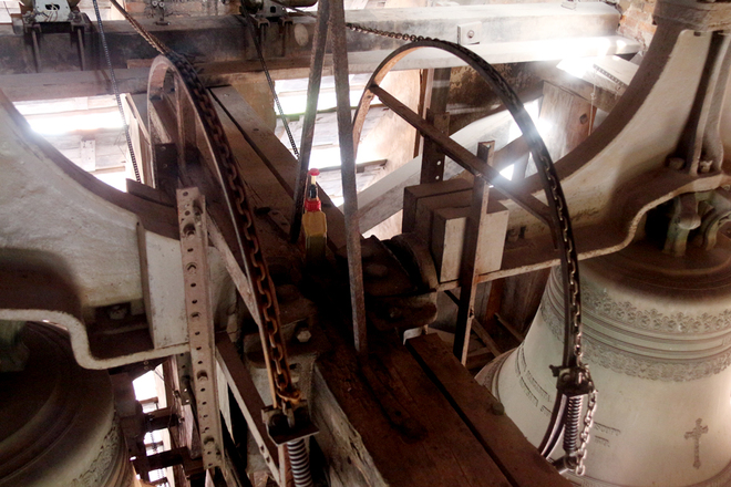 Những chiếc chuông được điều khiển bằng điện từ bên dưới. Riêng ba quả chuông lớn trước khi đánh đều được khởi động bằng cách đạp (vì quá nặng) cho lắc trước khi bật rờle điện. Khi đổ cùng lúc 6 chuông, tiếng chuông được cho là vang xa trong phạm vi khoảng 10 km.