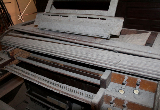 Phần điều khiển đàn nằm riêng nối với thân đàn bằng những trục, có những phím đàn như đàn organ bình thường hiện nay dùng tay gõ và những phím to đặt dưới sàn nhà (dài chừng 3m, ngang khoảng 1m) để người điều khiển đàn đạp lên khi dùng nốt trầm.
