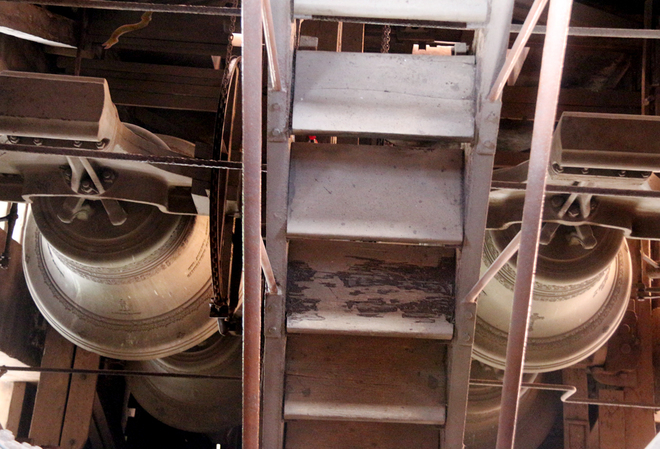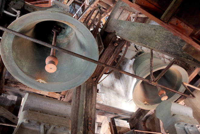 Gác chuông cao gần 37 m kể từ mặt đất, rất tối. Sàn được lót sơ sài bằng những miếng gỗ nhỏ cách khoảng, nhìn xuống sâu hút, lạnh người. Gác chuông bên phải (phía bên Trường Hòa Bình) có hai chuông mang tên nốt nhạc La và Do. Gác chuông bên trái có 4 quả chuông Sol, Si, Mi và Re.