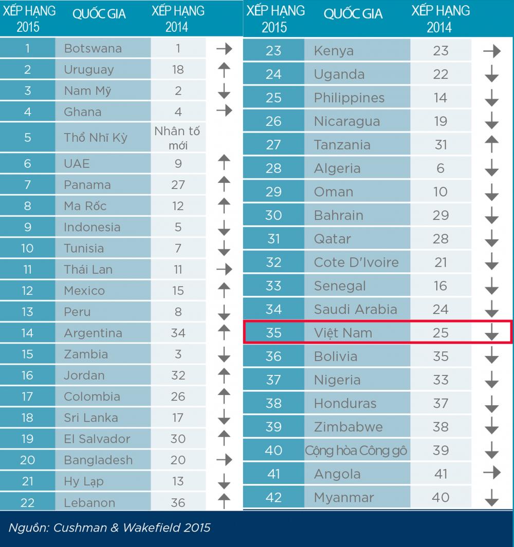So sánh với bảng xếp hạng năm 2014, năm nay Việt Nam tiếp tục lao dốc xuống thêm đến 10 hạng, xếp thứ 35 trong tổng số 42 thị trường được khảo sát có mức rủi ro thấp nhất và trở thành 1 trong 10 nước có mức độ rủi ro cao đối với nhà đầu tư.