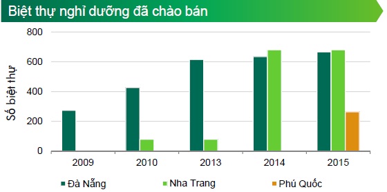 Bà Dung đưa ra dẫn chứng rằng trong 9 tháng qua, tại thành phố Đà Nẵng, giao dịch BĐS nghỉ dưỡng đã tăng đến 12 lần so với cùng kỳ năm ngoái. Tức là, trong năm 2017 chỉ có 7 căn biệt thự nghỉ dưỡng tại đây được khách hàng mua, thì nay con số này đã lên đến 87 căn. Tiếp theo đó, giao dịch tại Nha Trang cũng tăng 3 lần theo năm, từ 103 căn trong năm 2014 lên 341 căn trong 3 quý của năm 2015. Giao dịch biệt thự tại Phú Quốc hiện được xem là một con số lớn khi tăng đến 100% chỉ trong 9 tháng qua, từ không có căn nào được bán trong năm 2014 đến 264 căn tính đến thời điểm hiện nay.