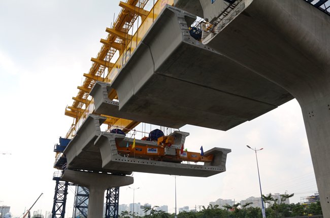 Các đốt dầm có mặt cắt hình chữ U đã được đúc sẵn ở bãi đúc tại Quận 9 với tổng cộng 4.536 đốt, mỗi đốt nặng 42 tấn, rồi vận chuyển ra công trường bằng xe tải chuyên dụng. Mỗi nhịp cầu đoạn đi trên cao gồm 13 đốt dầm sẽ được treo trên hệ đà giáo di động và ghép thành một nhịp cầu hoàn chỉnh. Các đốt dầm được liên kết vĩnh cửu với nhau bởi khóa chống cắt, keo epoxy và cáp dự ứng lực dọc theo dầm.