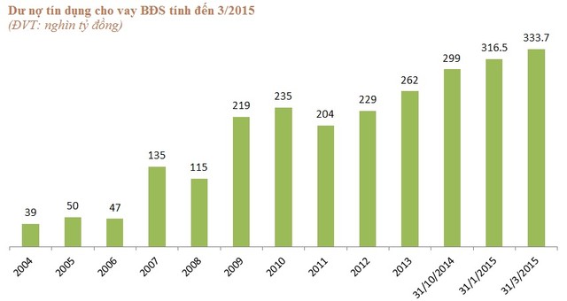 Cụ thể, số liệu từ báo cáo của Bộ Xây dựng cho thấy thống dư nợ tín dụng trong lĩnh vực bất động sản tính đến 31/03/2015 đạt 333.701 tỷ đồng, tăng 10,5% so với thời điểm 31/12/2014.