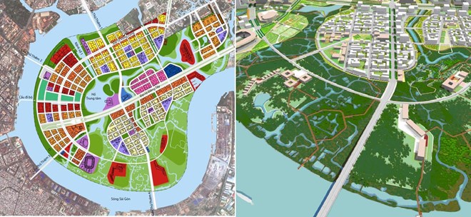 Vị trí cầu Tủ Thiêm 4 (bên trái) và khu đô thị sẽ kết nối trực tiếp tại bán đảo Thủ Thiêm (bân phải). (Ảnh: Ban quản lý khu Thủ Thiêm)